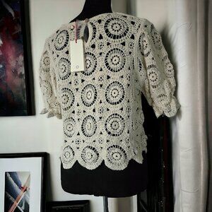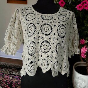 NWT SOLITAIRE (MED) Cream Doily Laced Cropped Crochet Cinched Short Sleeves