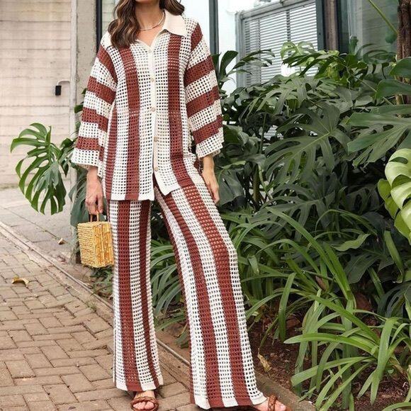 NWT SOLITAIRE SZ M 2 Piece Knit Crochet Top and Drawstring Pants Set