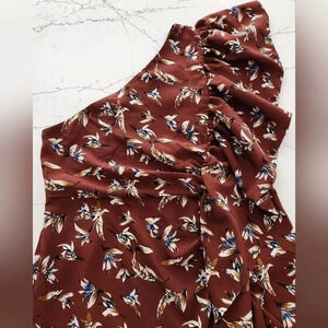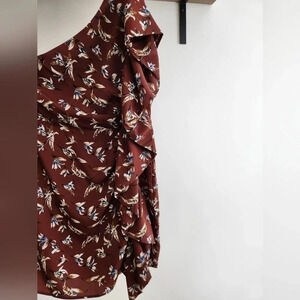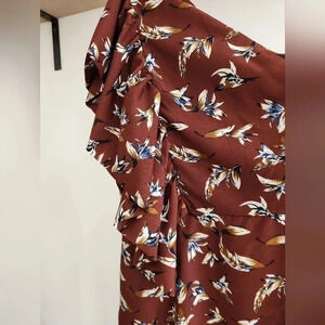 Details: Burgundy dress with mustard, white and navy floral print, sleeveless on one side, wide ruffle down the other side, lined bodice