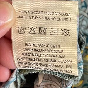 High-rise, slim fit through waist and hip. Back welt pockets; zipper fly with one-button closure. Intricately detailed vintage India-inspired floral pattern. Machine wash.