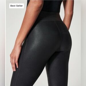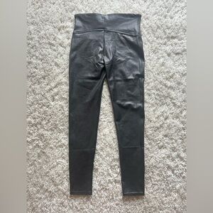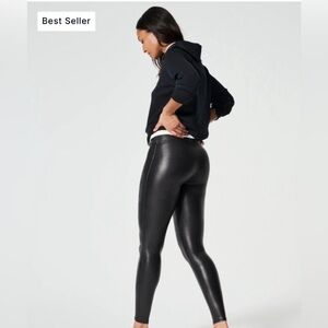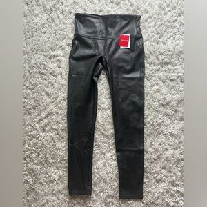 SPANX Black Faux Leather Leggings. New with tags! These are a staple wardrobe piece. Can be worn as a leisure or can be dressed up with a sweater and boots. These leggings have a lot of support and create a feminine silhouette. New with tag still attached. See pictures for approximate measurements. Women’s size large.