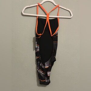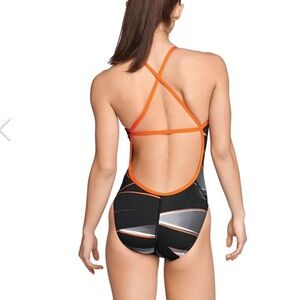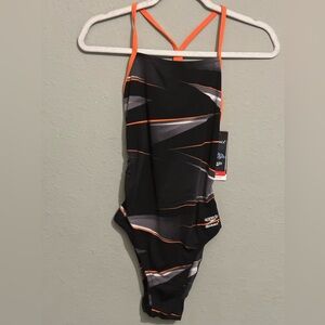 Stylish Speedo one piece with dynamic black and orange pattern. Ideal for swimming enthusiasts.