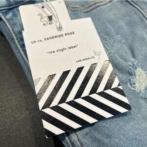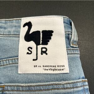 Keywords: SR vs Sandrine Rose jeans, The Virgin Label, flare jeans, distressed light wash, 5-pocket jeans, women’s size 24, high-quality cotton denim, casual chic style, retro flare.