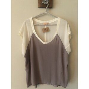 This is a women's NWT semi-sheer lightweight top in tan and cream from SS Sis Sis, size Large.