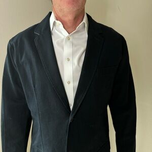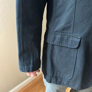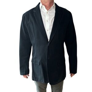 Size XXL. Dark blue. New with tag attached. Pristine condition - back vent is still stitched closed. 100% Cotton- substantial weight. Very nice quality! Partially lined in preppy striped cotton. 2 button front, single vent. 4 buttons on sleeve. Pockets: 2 flap ones on front, 1 on chest, 2 on inside. Model in photo is 5’11” size 42R/Large/waist 34. Jacket is too big for him but wanted it try to show style/fit. Seems to run small though for an XXL. Approximate measurements (taken when laying flat - cannot guarantee fit):