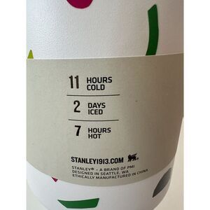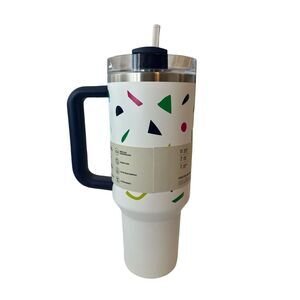 Introducing the STANLEY Tumbler Quencher H2.0, a 40-ounce tumbler that is perfect for keeping your hot or cold beverages at the right temperature for up to 7 and 11 hours, respectively. Its stainless steel material and abstract geometric pattern make it a stylish addition to your kitchen collection. With its straw and handle features, it is perfect for on-the-go use.