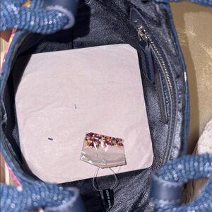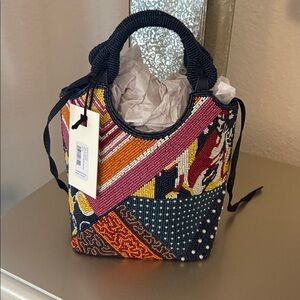 Chic Staud tote with intricate beadwork. Features bold geometric patterns. Perfect for adding flair to any outfit. New with tag. Includes dust bag.