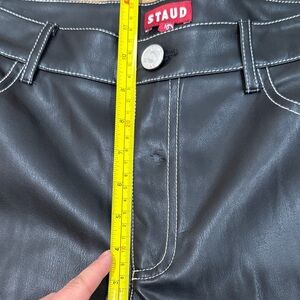 STAUD pants vegan leather straight leg trousers black contrast stitching fall staple timeless chic edgy modern minimalist closet essential elevated capsule wardrobe luxury aesthetic trending runway inspired quiet luxury model off duty streetwear versatile layering