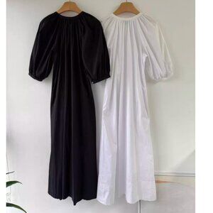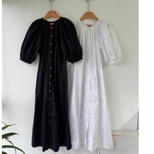 An oversized, breezy dress made out of our classic cotton poplin fabric. This dress features balloon sleeves, side seam pockets, and a button front closure. Pair it with your favorite belt or wear as-is.