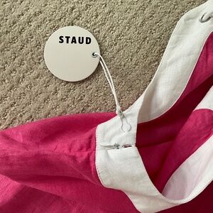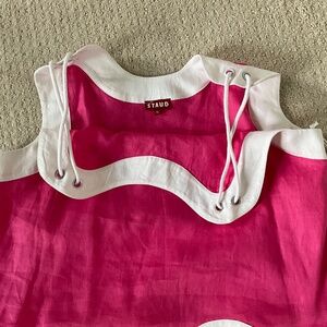 100% linen in hot pink with white wavy trim. Size XL. Dry clean only. Please see pictures for measurements. Price is firm.