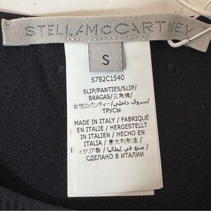Size Small. Black with gold side chains. Brand new with all tags attached and plastic hygienic liner in place. Also includes additional paper hang tag that is not safety pinned on which is a guarantee that item has never been worn! PRISTINE CONDITION. Also includes branded Stella McCartney travel pouch. NO RETURNS!