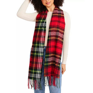 Description: Enjoy the classic tartan-style plaid of Steve Madden's fringe-trimmed scarf, a quintessential accessory! Style Idea: Flaunt your outfit coordination credentials by opting for this laid-back pairing of a black and white horizontal-striped long-sleeve t-shirt and a red plaid scarf. Take this look down a more glamorous path with black leather ankle boots.