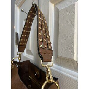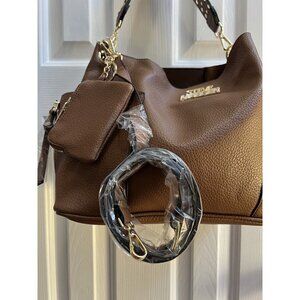 This is a brand new Steve Madden Nutshell satchel bag with a classic signature pattern. The bag has a brown woven handle/strap and a detachable strap. It is a medium-sized crossbody bag made of faux leather with a brown lining material. The hardware color is silver and the exterior color is brown. The bag has a zip closure and features a satchel style. It is part of the Steve Madden product line and comes with accessories.