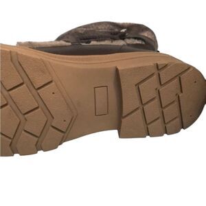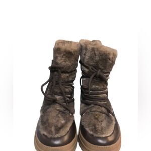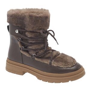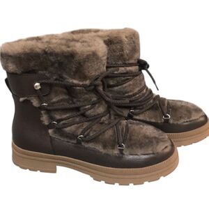 Keywords: STEVE MADDEN, women's bootie, brown boot, faux fur, lace-up, winter boots, casual footwear, size 8, round toe, durable sole, cozy lining, winter fashion, comfortable boots, stylish booties, rubber outsole.
