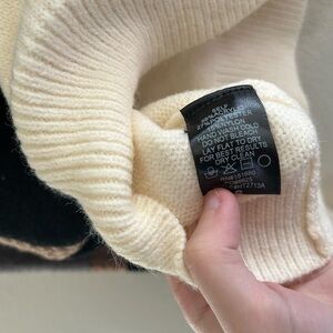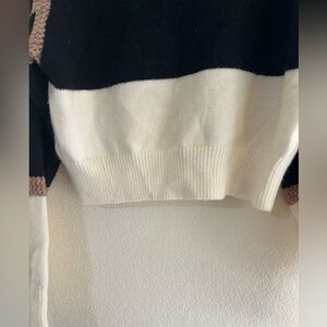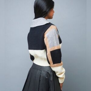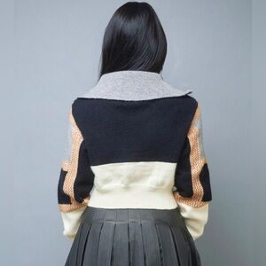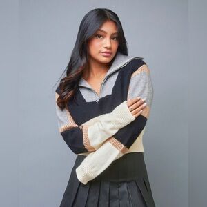This cozy and stylish sweater would be perfect for your winter wardrobe. Crafted from a soft and stretchy knit, it features a beautiful color block pattern in cream, beige, black, and grey. The sweater has a fashionable foldover collared neckline and is adorned with a quarter-length front zipper for added charm. The Dolman-style long sleeves with fitted cuffs and a relaxed, cozy bodice give it a laid-back yet chic look, finishing with a slightly cropped hem. The ribbed detailing at the cuffs and hem add a touch of texture and completes the overall stylish appeal of the sweater.