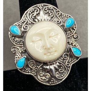 New with tag……. STS 925 sterling silver, genuine sleeping turquoise gemstone, and carved bone goddess face ring. Marked 925 with STS Indonesia tag. The face of the ring measures 1.5" in diameter.Fits size 8/8.5.