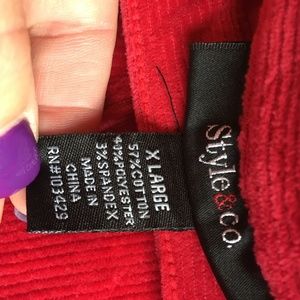 Red comfort waist, elastic waistband for comfort and mid rise. These are so cute and would be great for the holiday with many different outfits and yes they are legging so your tummy will have more room to eat and you will be comfortable. they are 57% cotton, 40% polyester and 3% spandex. the measurements are waist 34 inches. rise 11 inches and inseam 29.5 inches They are great because they have the detail of a pant 2 real pockets in back, 2 faux pockets and faux zipper in front. no smoke