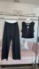 This outfit features a minimalist black two-piece set. The top is a sleeveless, fitted vest with a V-neckline and a row of metallic buttons down the center. The bottom piece is a pair of relaxed, wide-leg pants in a boxer sweatpants style. The pants have a comfortable elastic waistband, adding a casual and sporty vibe to the look. The set is paired with simple white sneakers, creating an effortlessly chic ensemble that blends elegance with casual comfort. Shoes are not included
