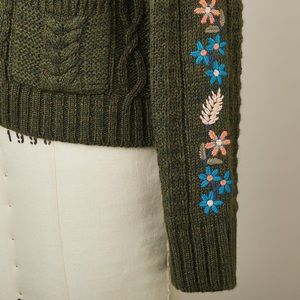 Vintage vibe, lushly embroidered cardigan, with cable details, shell buttons, velvet and grosgrain ribbon placket.