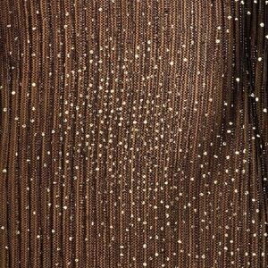 94% rayon, 6% spandex. Snap button closures at bottom. Surplice neckline. Sheer fabric. Metallic accents throughout. Black and gold. Size small. New with tags