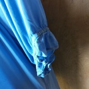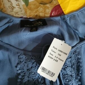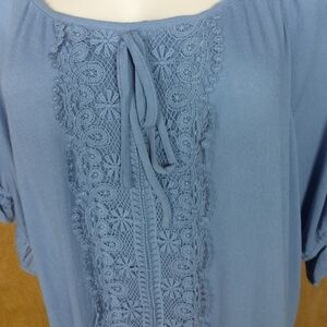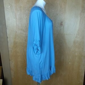 Lightweight material. Tie accent. Embroidered front. Ruffled edges. Hangs long