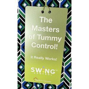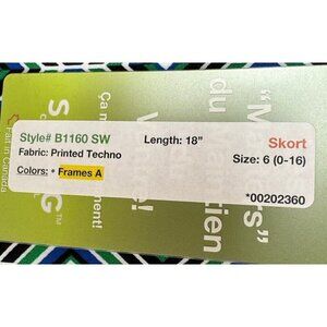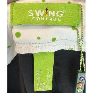 The product is a Swing Control women's golf skort in blue, green, and black colors, size 6. Made of a blend of nylon, spandex, and rayon, it features a stretchy material ideal for golfing. The skort has an athletic style with a short skirt length, suitable for active performance on the golf course.