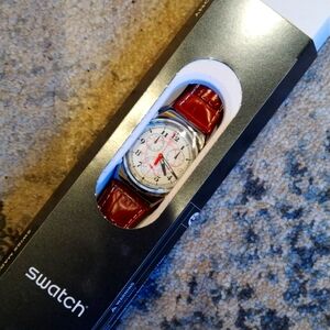 Here is a great deal on a brand new Swatch watch from our closet. This watch is selling on eBay for more than our offering price and is very popular. The watch is 44 mm in diameter. It features a two-piece leather strap with butterfly closure, the famous swatch Swiss movement, water resistant to 30 M, has Chrono function and date window, and for Jewels in the movement. It has a 1-year or more swatch warranty with it, box and all papers as shown.