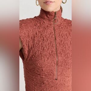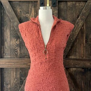 Richly textured fabric composes this unique and figure-skimming Sabina Musayev dress. Padding accentuates the shoulders, and a half-zip mock neckline lends an unexpected touch of sporty style to the silhouette.