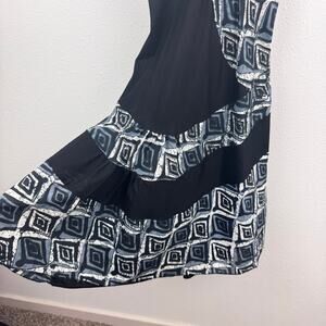 Black with grayscale geometric print, v-neck, halter neck with tie closure, elasticized back band, lightweight cotton, size medium.