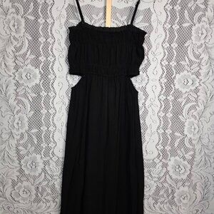Sage the Label black midi dress with side cutouts and spaghetti straps.
