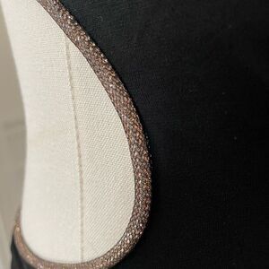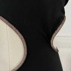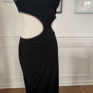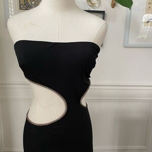 New with tags, Saints and Secrets black strapless cut out maxi dress. The cut outs are trimmed in a copper gold color rhinestone cord. there is an exposed zipper at the top of the band that wraps around the bust. There is a back zipper for the skirt. Very stretchy at 90% polyester with 10% spandex. Hand wash and line dry. Laying flat measures 47 inches shoulder to hem and 16” armpit to armpit.