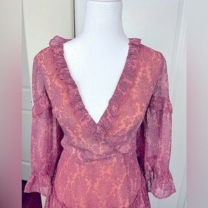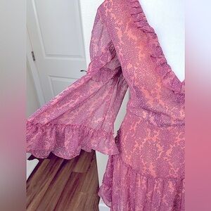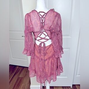 Flirty and feminine pink, ruffled, floral mini dress by Saints and Secrets. Lovely lace up back detail. Size Medium. Totally boho and just in time for spring!