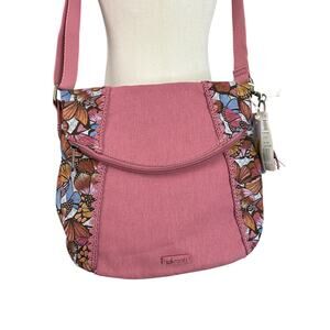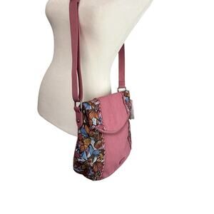 New with tags Sakroots Artist Circle Fold Over Crossbody Bag. Butterfly pattern in the color mulberry. Adjustable strap for crossbody or shoulder bag.