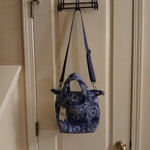 NWT Sakroots Culver navy, blue, and white boho print bag with adjustable removable strap and matching cosmetic removable bag.