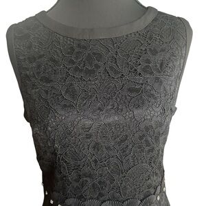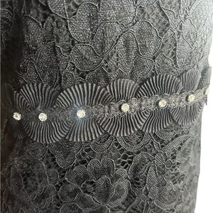 Chic black lace midi dress. Sleeveless design with elegant detailing around the waist. Perfect for parties or evenings out.
