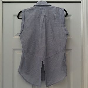 Chambray light blue and white pin stripe sleeveless top from Sam Edelman. Button detail on the front is hidden when wearing with panel that covers buttons, see photos. Split detail on bottom of back of top. Size XS. Approximately 17 from armpit to armpit. New with tags. No trades. Price is firm.
