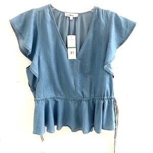Designed with a V-neck, this blouse by Sam Edelman features a circle-cut sleeve with flare, functional tunnel waist ties, and circular peplum flare.