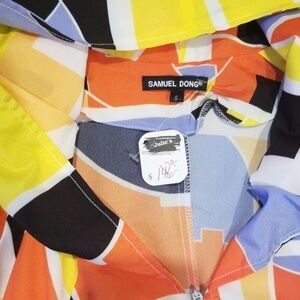 NWT Samuel Dong designer abstract print top. Flows like a silk scarf. Has a balloon type bottom with splits at four points. Collar is wide almost a hood. Has welted pockets on sides. Can be worn as a dress, a top, or cover. Ready for any special event!!