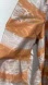 Fabulous huge collar that can stand up in the back to lift all around for added drama. Tan base painted with silver and gold-brown metallic paint. Glitters lightly. Wide sash tie, button front. New, with tags including extra buttons. Fully lined. Polyester/Nylon. Based on style number, I believe this is from 1994