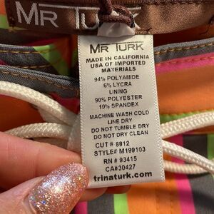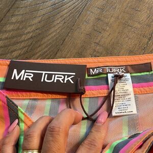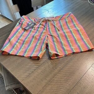 Trina Turk's Unisex label Mr. Turk. Made in California USA Unisex Board Shorts. NWT MR Turk Swimming Trunks Classic Neon colors 3 pockets button and zipper measurements on the pictures. 16 1/2 inch across waist for up to 33" waist.