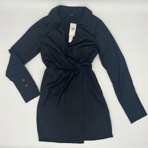 Sanctuary black wrap mini dress, size 2, brand new with tags ($149 retail). Features a chic collared neckline, long sleeves with double button cuffs, and a flattering draped silhouette. Perfect for work, evening wear, or special occasions.