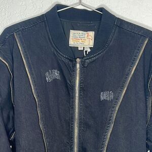 Distressed denim and zipper details give this oversized bomber an edgy look and feel. Pair with jeans, over a maxi, or with shorts- it will take you from errands to a concert.
