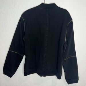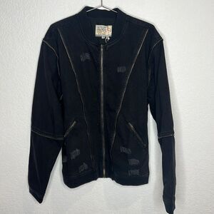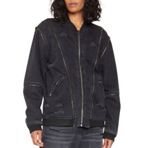 Distressed denim and zipper details give this oversized bomber an edgy look and feel. Pair with jeans, over a maxi, or with shorts- it will take you from errands to a concert.