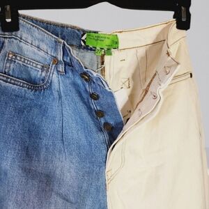 These retro inspired statement-making jeans feature a colorblock design in a slouchy, straight silhouette with pleating at the top for added shape.