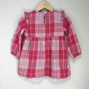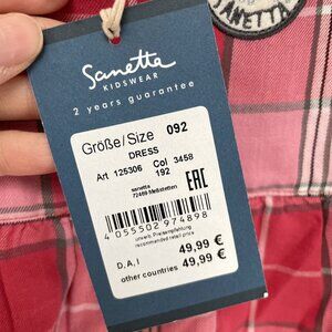 NWT European brand Sanetta red and pink plaid dress with long sleeves, logo patch on chest and partially skirt lined with gray layer and tulle ruffle at bottom. Key hole button in back and small shoulder ruffles. Super soft fabric, with red, white, gray, and pink plaid. Perfect for special occasions, Holidays, or every day wear. Size 92 in German/European sizing, about a size 2.