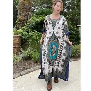 Get ready to turn heads with this stunning Sante Classics kaftan dress! This beautiful piece is brand new with tags and boasts a vibrant, boho-inspired design perfect for adding a touch of Bollywood flair to your wardrobe.
