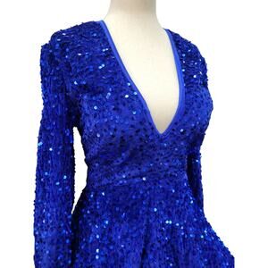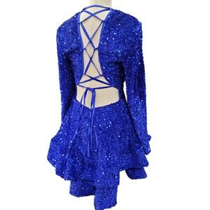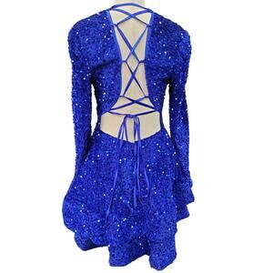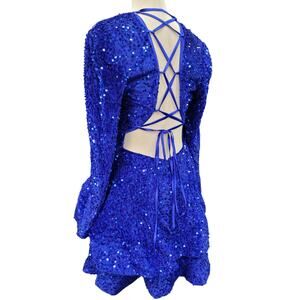 NWT Sapphire Blue Sequin Short Dress Long Sleeves Open Corset Back