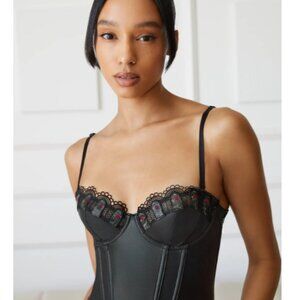 Meet your lace and leather alter-ego. Our Renaissance Rose Corset Dress is unlined with an underwire and features faux leather and rose embroidery, a power mesh back body, and an open back with functional lace-up detailing.