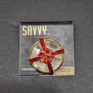 NWT Savvy by Swarovski Gift Package Brooch w/Green Enameled Edge & Red Bow