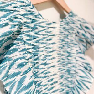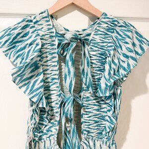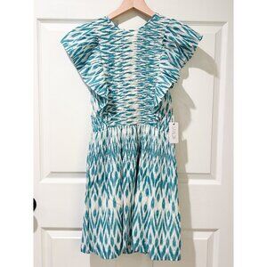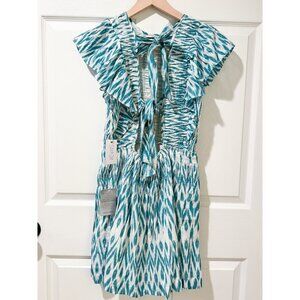 NWT Saylor Azalea Ikat Ruffle Boho Short Dress Teal White Rouched Tie Cotton SM